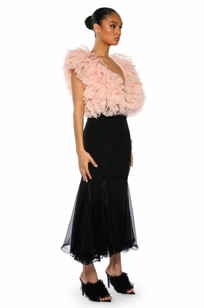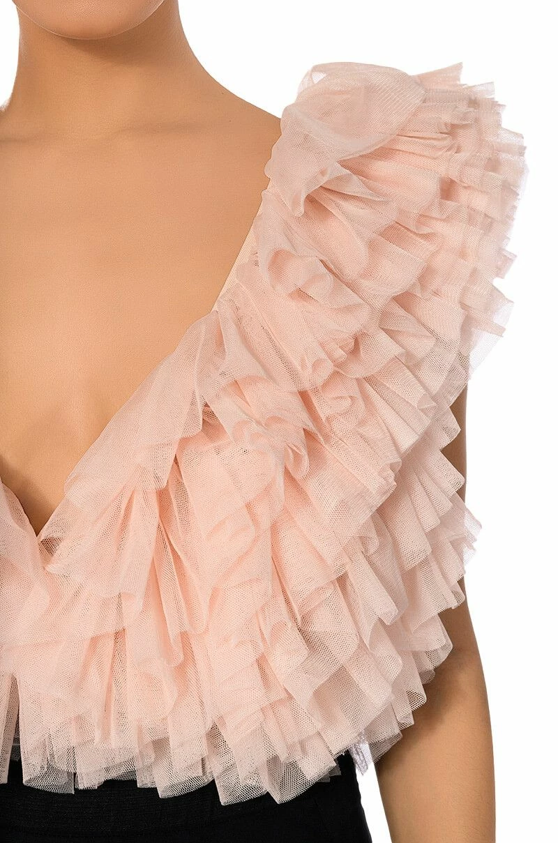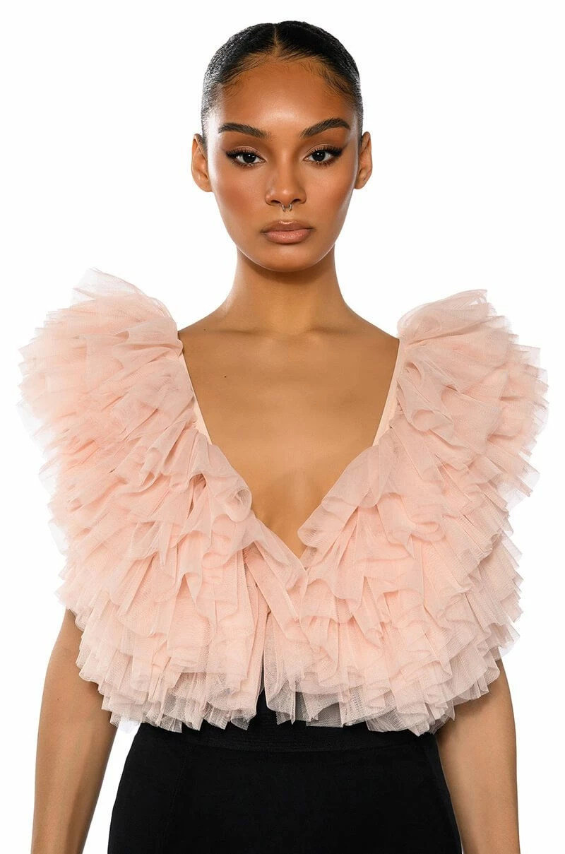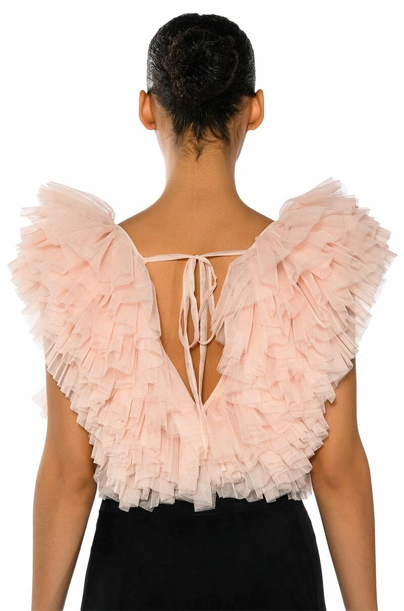 The AKIRA Label Romantic Tulle Ruffle Bodysuit features a stretchy smooth fabrication and deep v neckline complete with a snap button gusset fastening, festive tulle ruffle trim along the neckline, and an open back with tie detail. Style with high waist pants and heeled booties.