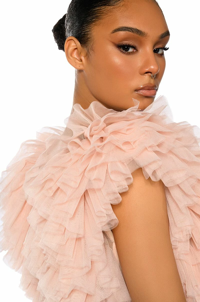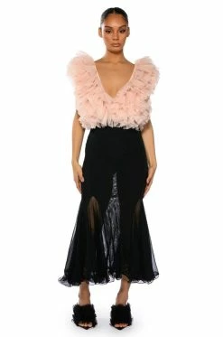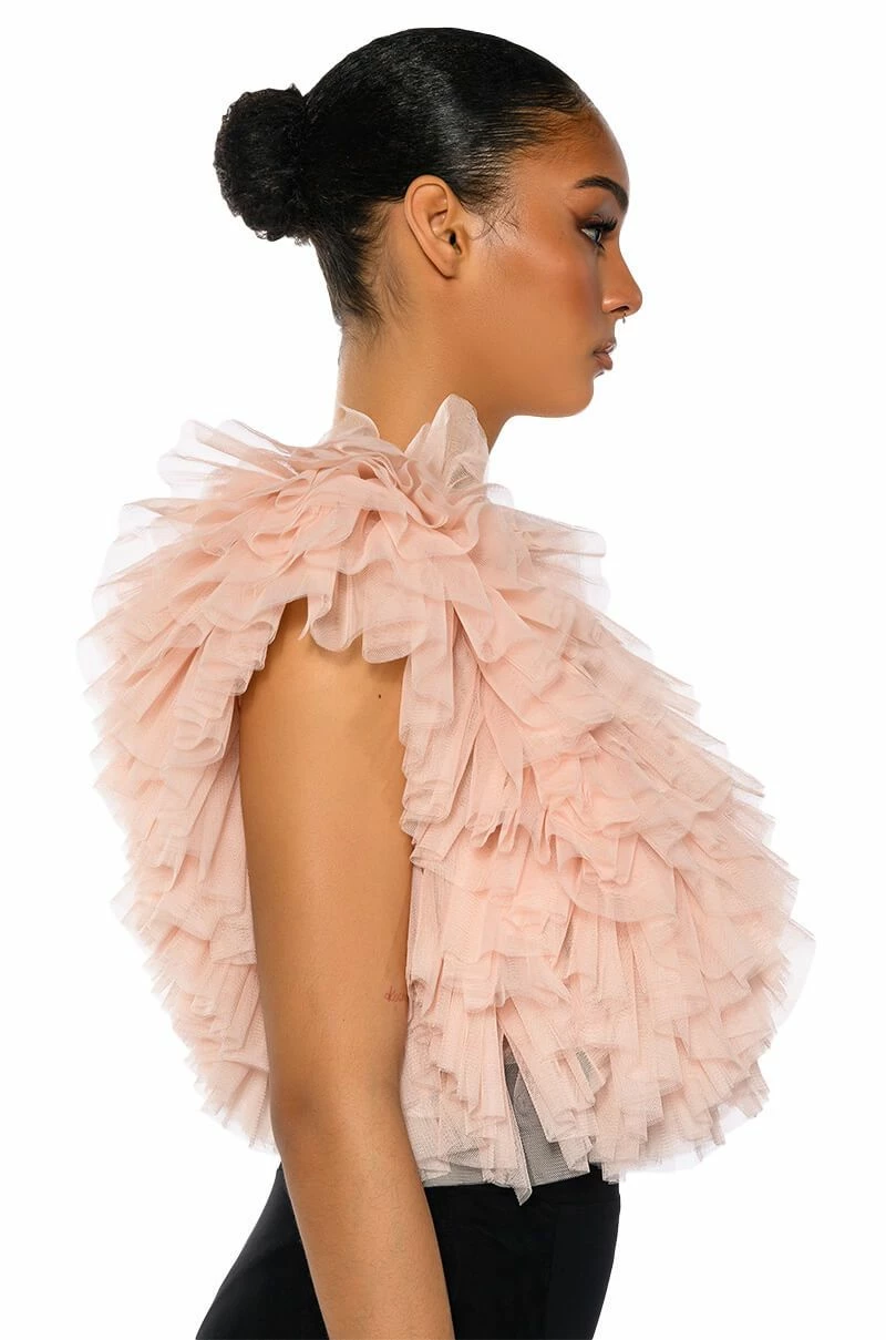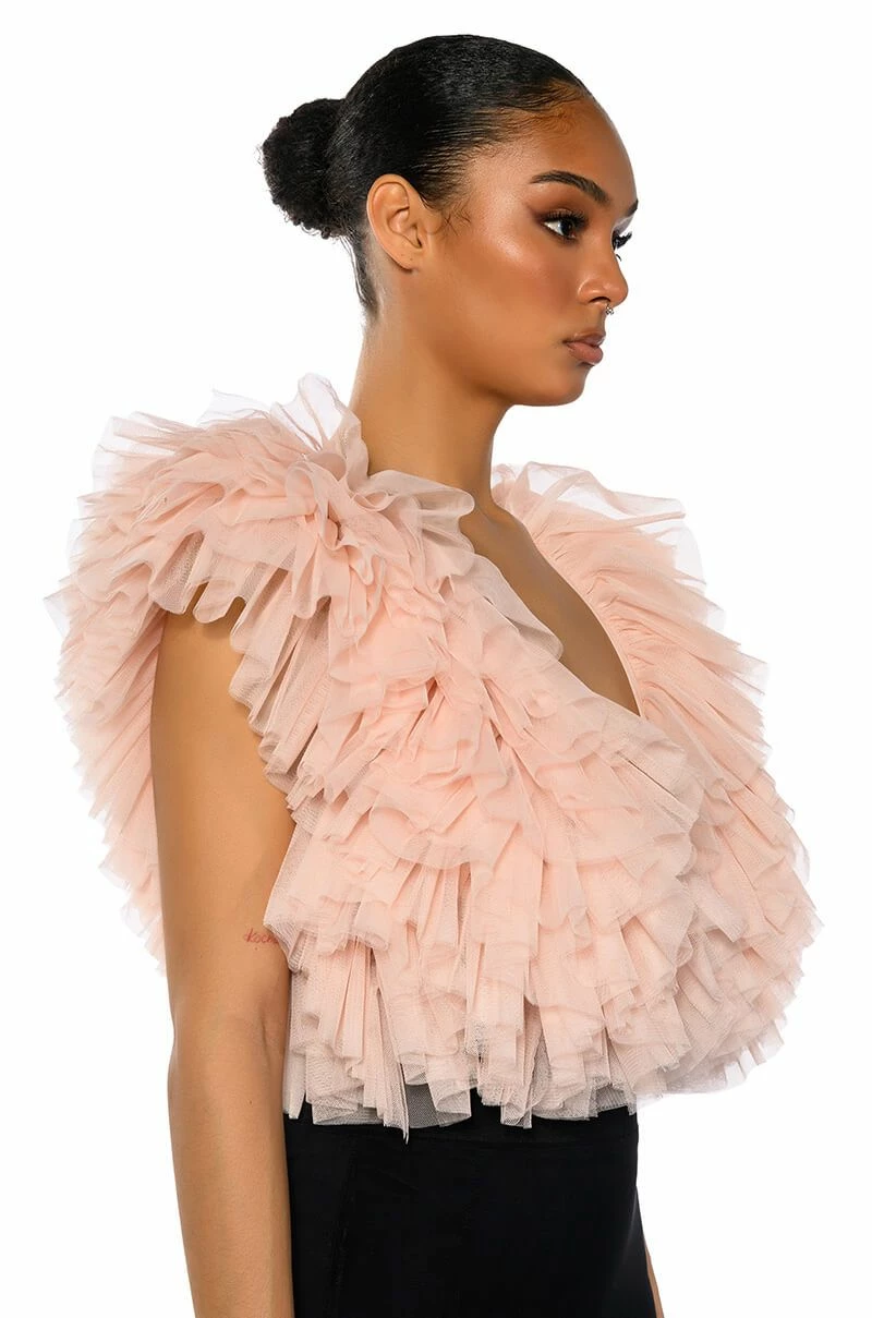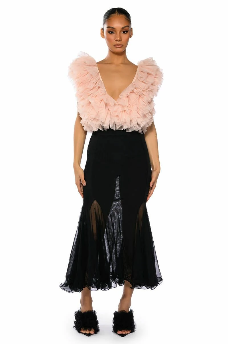 The AKIRA Label Romantic Tulle Ruffle Bodysuit features a stretchy smooth fabrication and deep v neckline complete with a snap button gusset fastening, festive tulle ruffle trim along the neckline, and an open back with tie detail. Style with high waist pants and heeled booties.