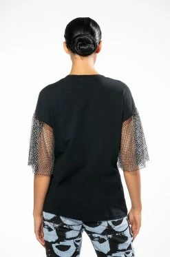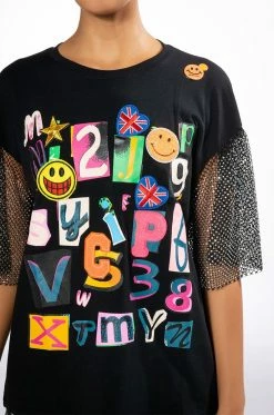 The AKIRA Label Scrapbook Rhinestone Sleeves Tshirt is made from a stretchy fabrication and features scattered graphic letter, number, and patch detailing, a crew neckline, boxy rhinestone mesh short sleeves, and a relaxed fit.