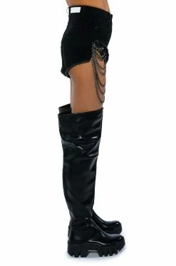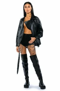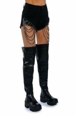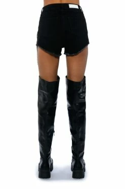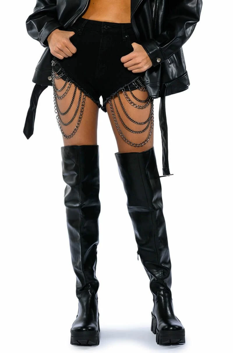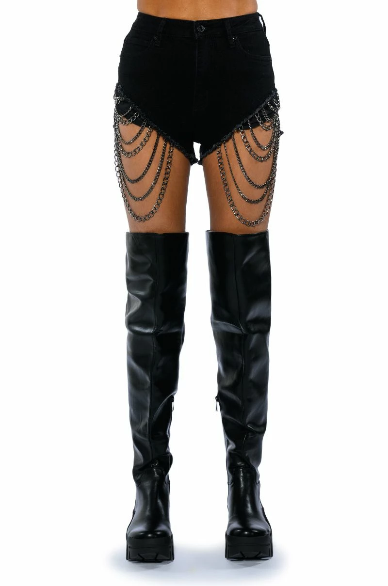 The AKIRA Label Sexy Chain Denim Shorts in Black are a high cut, ultra-glam denim short featuring a high rise waist, frayed hems, exposed pocket lining, and a functional five pocket design. Complete with zipper fly button-loop closure and draped chain link detailing. Style with a cropped sweater, tights, and combat boots.