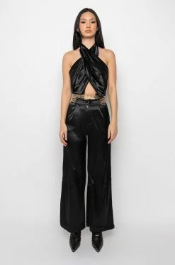 We’re living our Parisian fantasy in The AKIRA Label Sil Vous Plait Chain Detail Cropped Halter Blouse. This top is made from a lightweight satin fabrication and is complete with pleated detailing, a tie halter neckline, an open front design, layered chain links at the hem, and a shirred elastic backband with a small zipper closure. Complete your look with the matching AKIRA Label Sil Vous Plait Chain Detail Palazzo Pant.