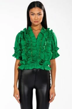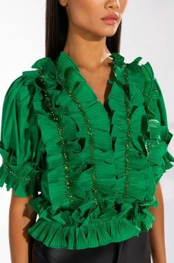 The AKIRA Label Simply Frilling Ruffled Short Sleeve Blouse is made from a light cotton fabrication and features a V neckline, dramatic ruffled frill detailing with beaded rhinestone trim along the body, sleeves, and hem, a cropped silhouette, and an elastic hem. Pair this piece with fitted trousers and pumps for an opulent night out look!