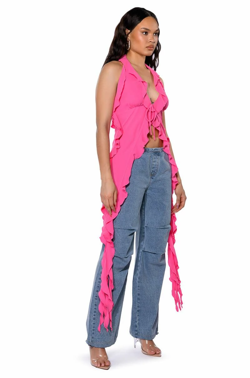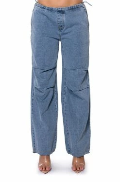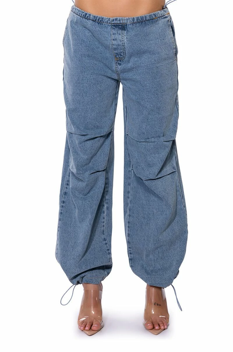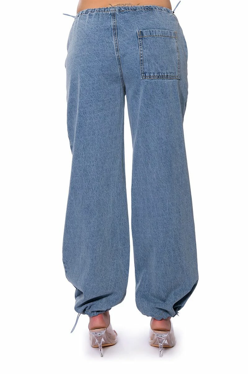 The AKIRA Label Skater Girl Denim Drawstring Pant features a cotton base fabrication, a high rise toggle drawstring waist, side pockets, a wide leg, relaxed fit, and subtle, front seam detailing. Complete with adjustable toggle drawstring bottom hems and a parachute-like fit. Pair this piece with a bomber jacket and chunky sneakers to complete your look.