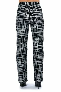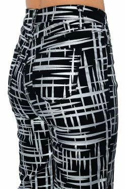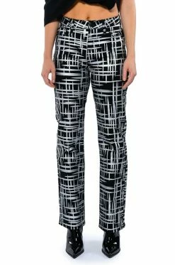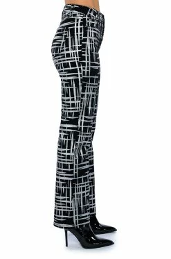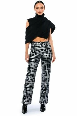 The AKIRA Label Something Different Metallic Detailed Jeans are a structured denim straight leg pant featuring a metallic painted cross hatch print, a high rise waist, working belt loops, and a classic five-pocket design. Complete with a front button and zipper closure.