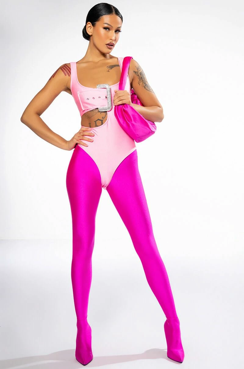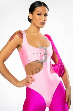 The AKIRA Label Spotlight Buckle Detail Cutout Cheeky Bodysuit is a glamorous piece featuring wide tank straps, a scoop neckline, a sleek and smooth fabrication, and an oversized pave faux front buckle closure. Complete with side cut out detailing, an attached cheekybottom, and a snap gusset closure.