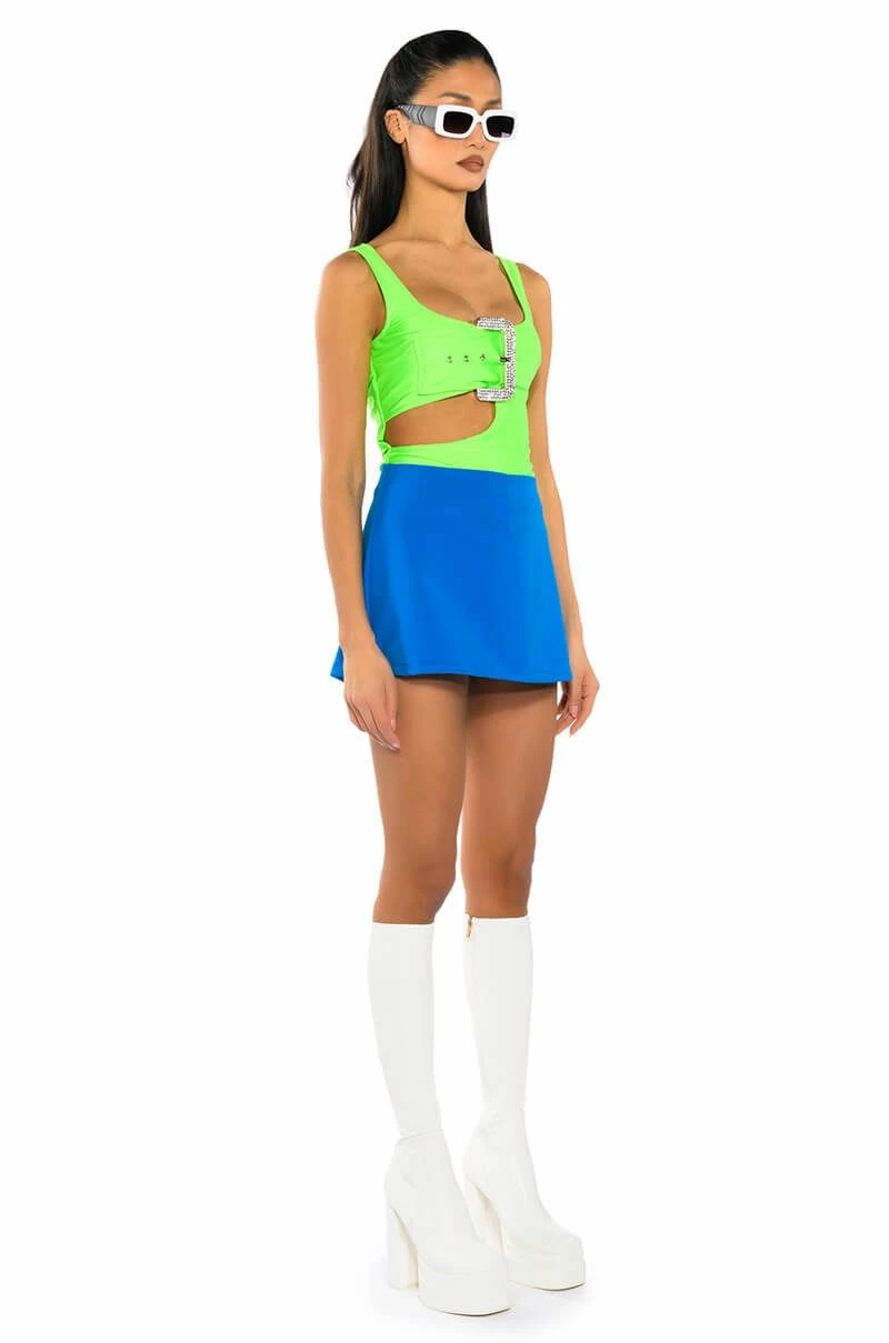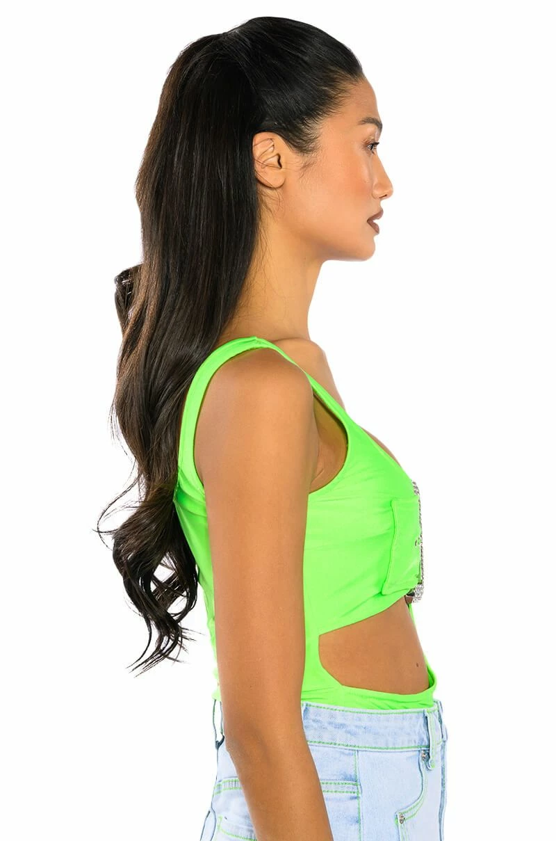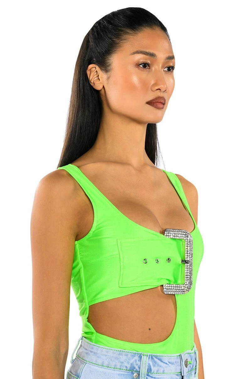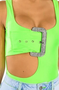 Shine a light on your style prowess with The AKIRA Label Spotlight Buckle Detail Neon Cutout Cheeky Bodysuit! This sexy piece features a vibrant neon hue, wide tank straps, a cut out front design, a scoop neckline, and an oversized rhinestone-embellished buckle accent. Complete with a cheeky cut silhouette and a snap-gusset closure. Style it under mom jeans and pointy toe mules for a cute date night look.