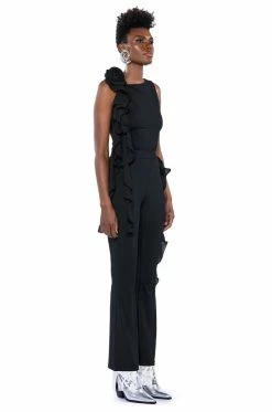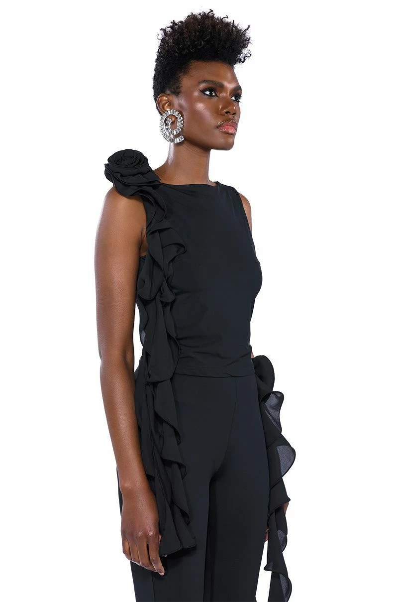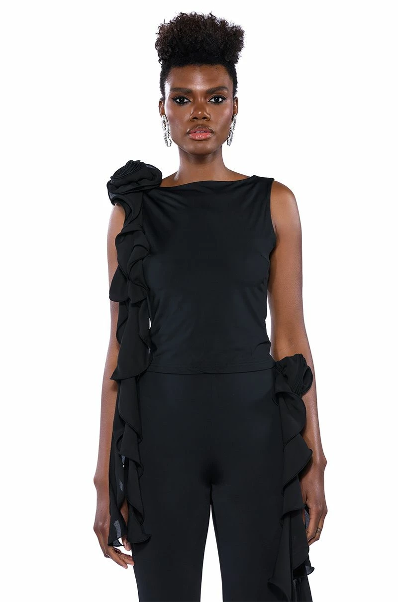 The AKIRA Label Stella Flounced Sleeveless Top is made from a sleek, stretchy base fabric and features a boat neckline, a bodycon fit, and a flouncy, mesh floral applique with a cascading ruffle detail on the shoulder. Complete with a sleeveless silhouette and a slip-on design. Style with the matching bottoms, The AKIRA Label Stella Flounced Flared Legging, for that chic, it-girl look.