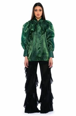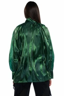 The AKIRA Label Talulla Tie Neck Long Sleeve Blouse is made from a glimmering, lightweight fabrication and features a high tie front neckline, long blouson sleeves with wide, buttoned cuffs, a longline silhouette, and button down front closures.