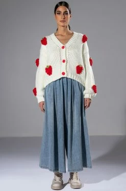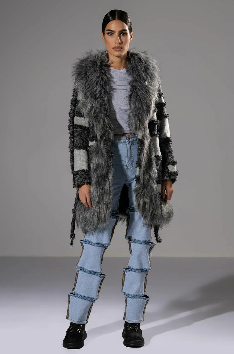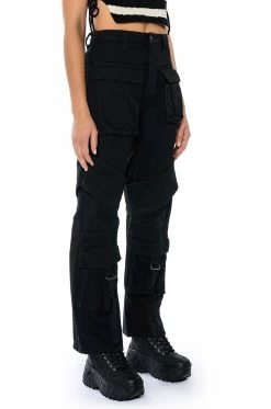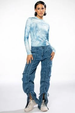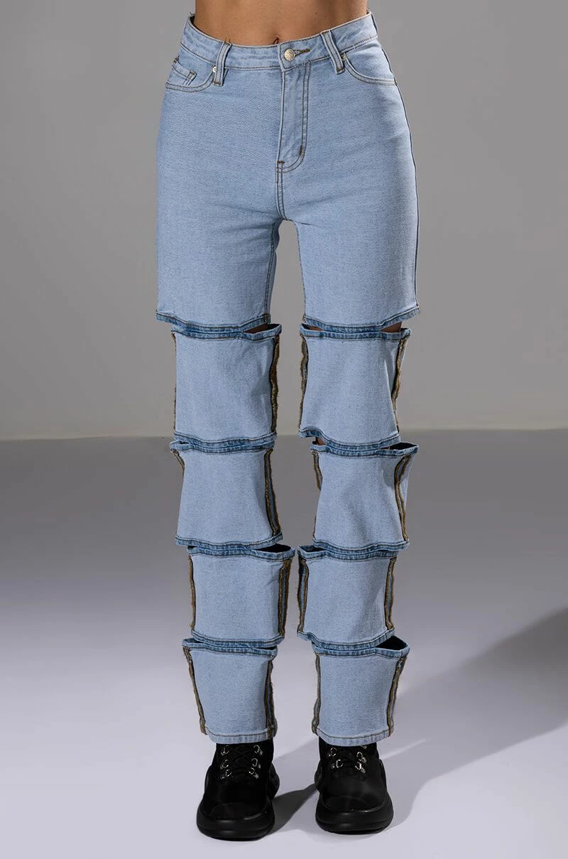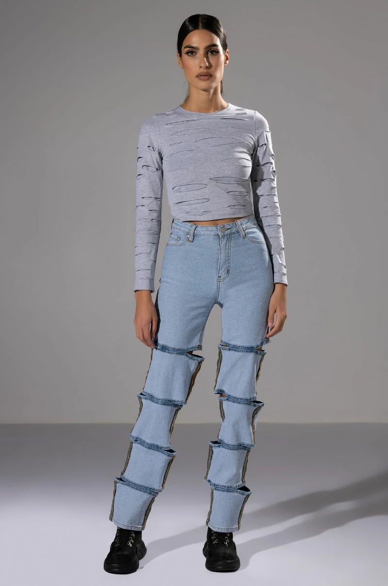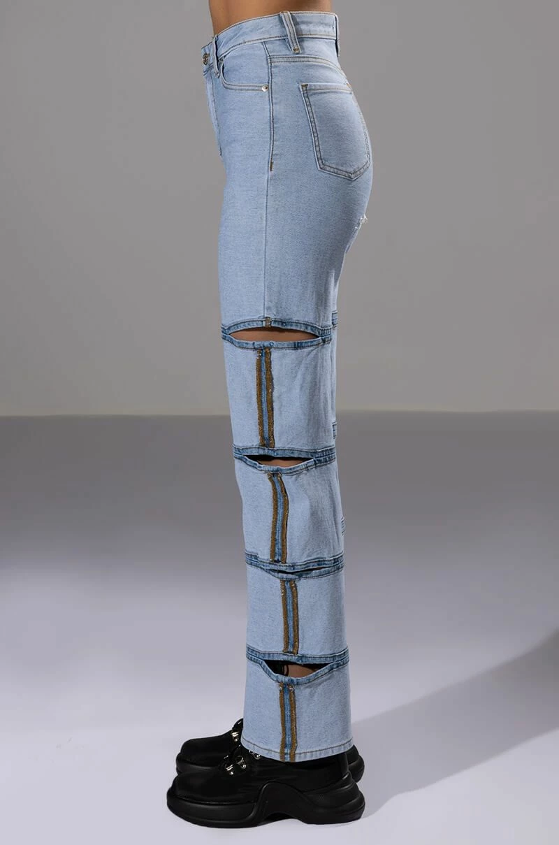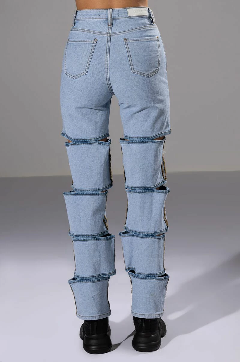 The AKIRA Label Temptation High Rise Layered Wide Leg Jean is made from a made from a washed, inside-out style denim fabrication and features a high rise waist, working belt loops, a classic five-pocket design, layered denim leg paneling with side cutouts, and a wide leg silhouette. Complete with a button and zipper front closure.