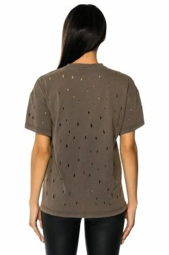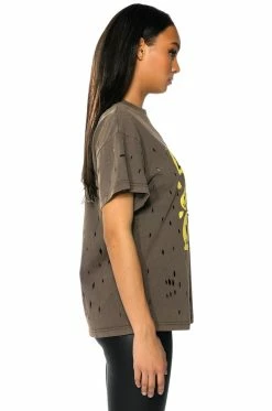 The Trippy Trippy Distressed Crew Neck Tshirt is made from a stretchy cotton fabrication and features a crew neckline, short sleeves, and an oversized silhouette. Complete with a trippy, warped smiley face graphic print and distressed hole detailing. Pair this graphic piece with distressed denim and combat boots to finish off your grungy casual look.