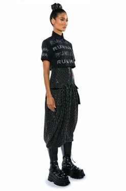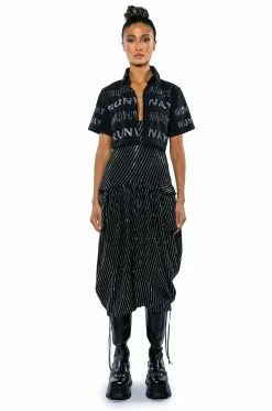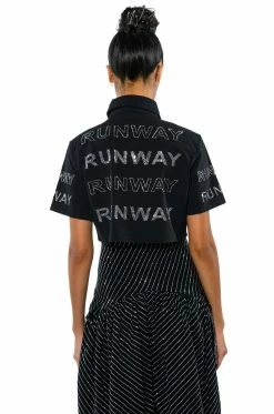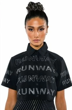 The AKIRA Label Walk The Walk Rhinestone Cropped Shirt is a short sleeve blouse featuring a structured cotton fabrication. a point collar design, a button down front placket, and a cropped silhouette. Complete with rhinestone text graphic detailing that reads “Runway,” throughout. Style this shirt with a sleek pair of legging boots.