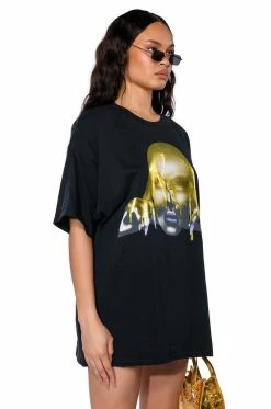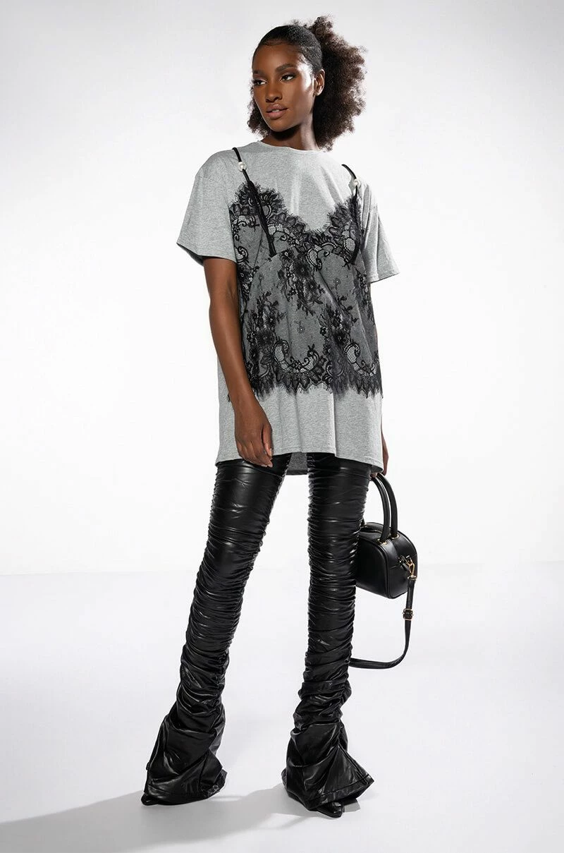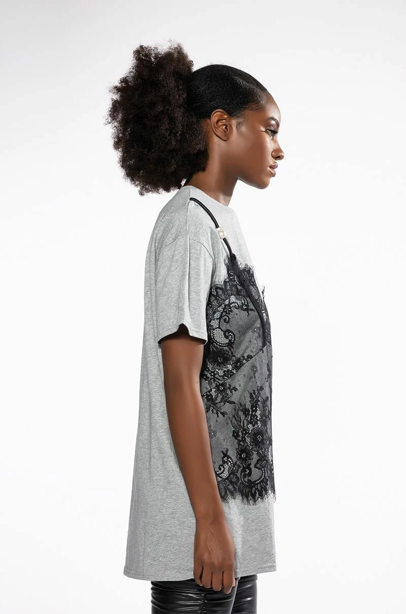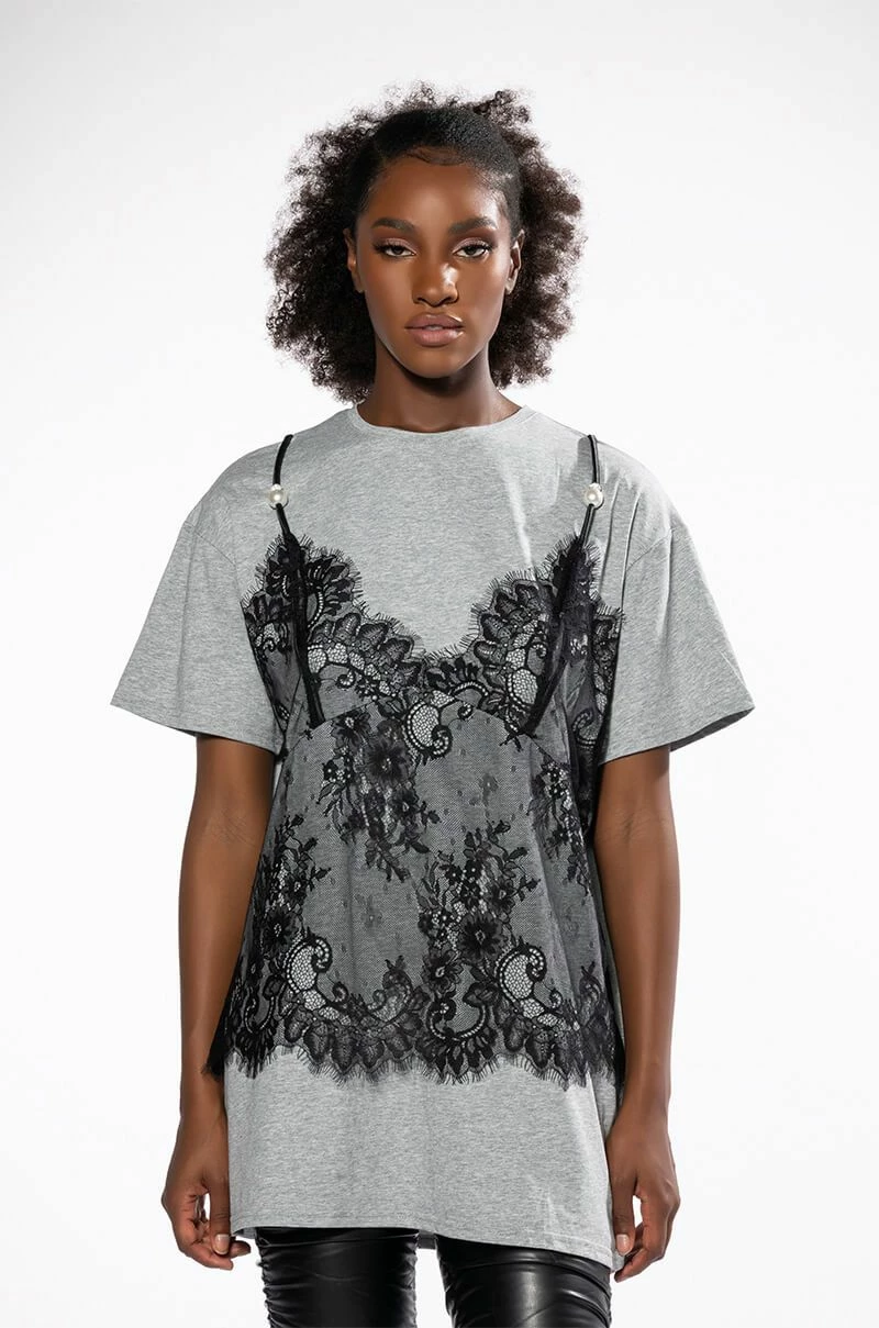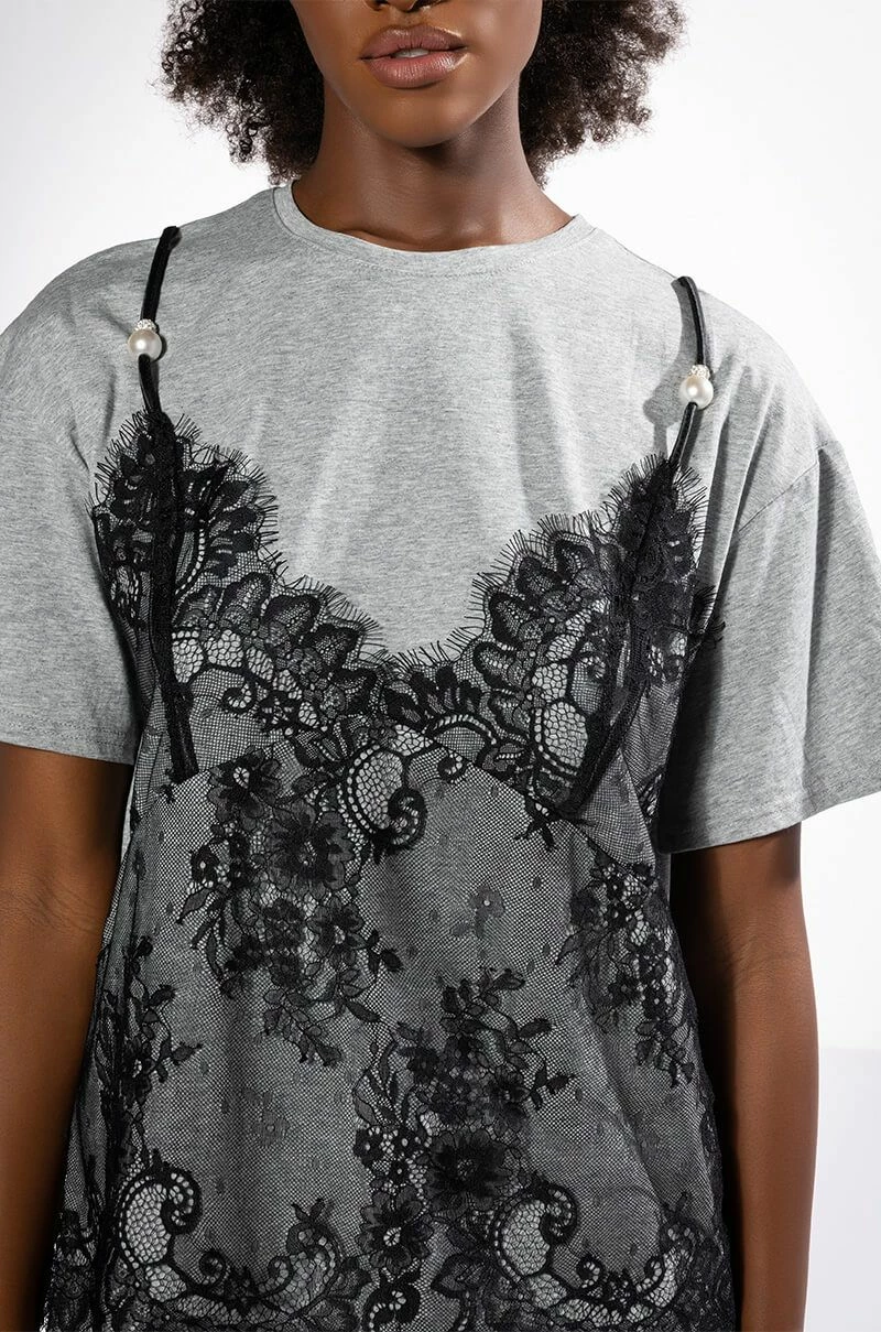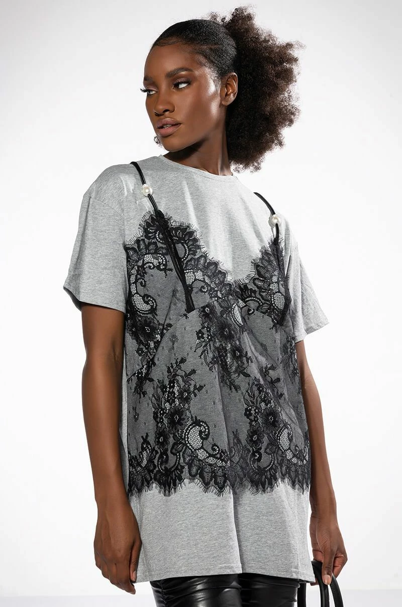 The AKIRA Label Winny Lace Detail Tshirt is made from a stretchy cotton fabrication and features a crew neckline, short sleeves, an ornate, cropped lace cami front overlay with pearl and rhinestone detail beads along the straps, and a boxy, oversized silhouette.