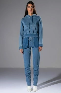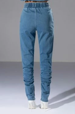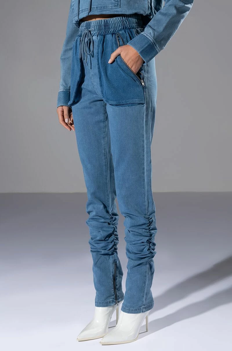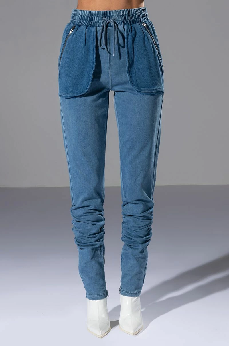 The AKIRA Label You Oughta Know Denim Jogger is a cozy denim based jogger, featuring a high waisted silhouette, an elastic waistband, and drawstring front closure. Complete with external zippered pockets with corduroy textured feel, ruching below the knee, and zippers at the inner ankle hems. Style this with the coordinating The AKIRA Label You Oughta Know Denim Hoodie and sneakers for an effortless look!